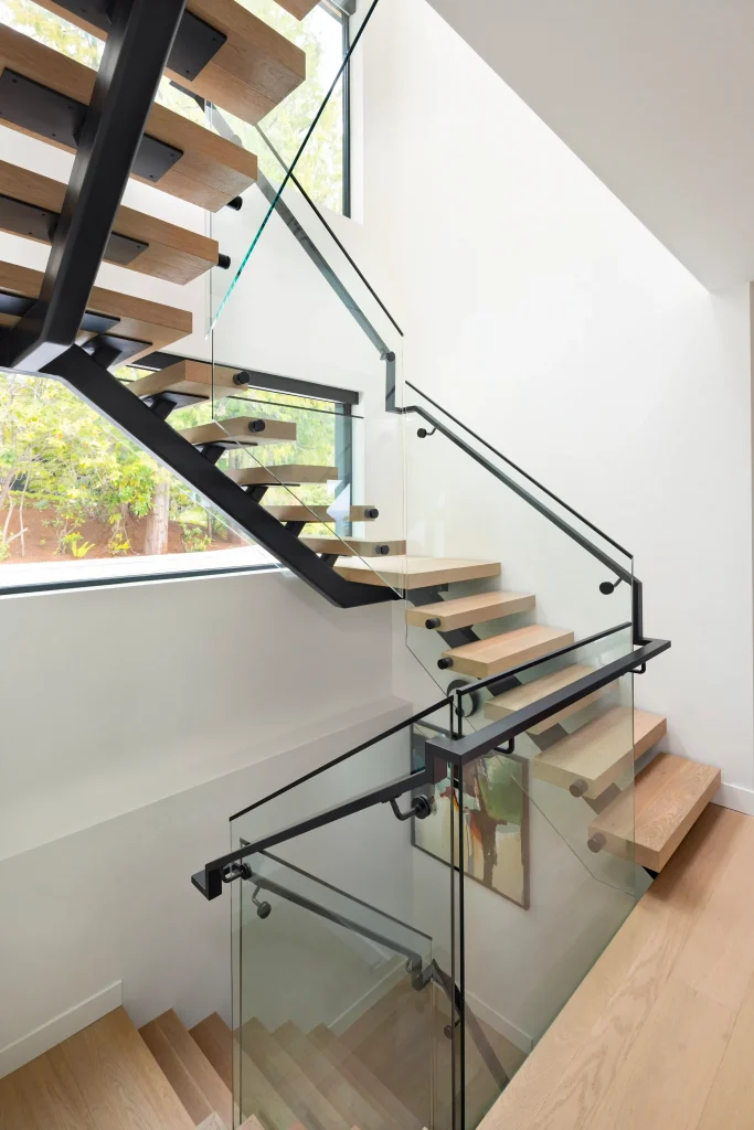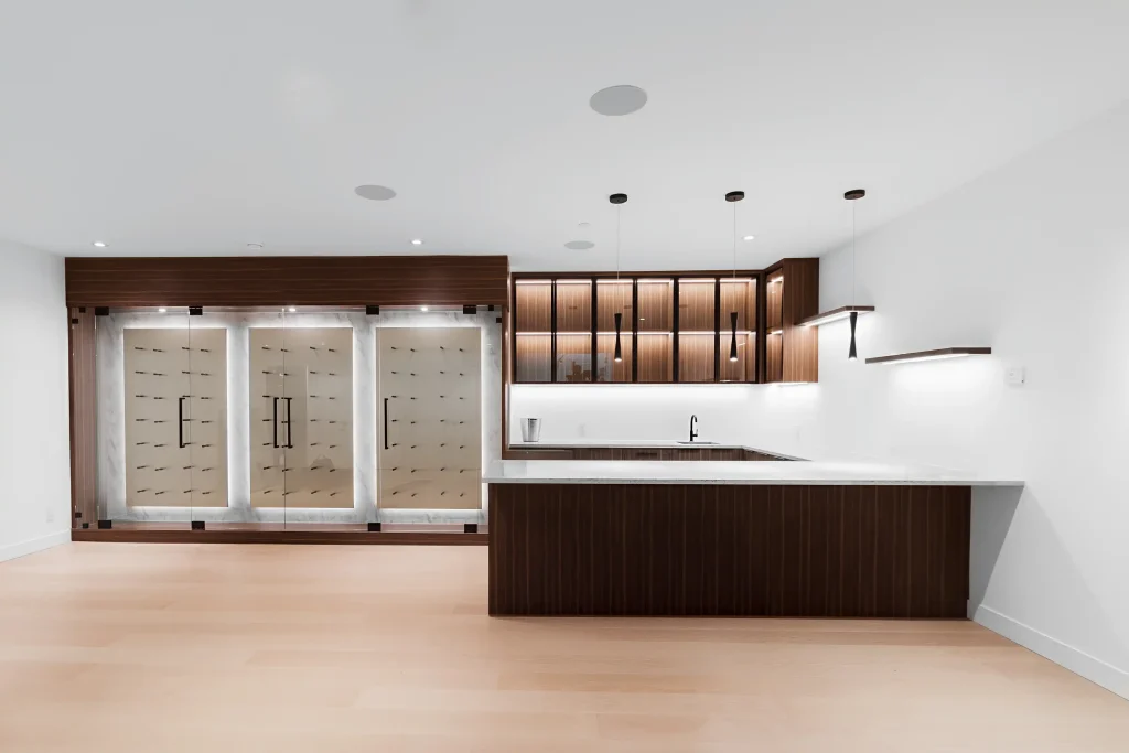 A striking steel staircase serves as the architectural centerpiece, reinforcing the home’s open feel. On the lower level, a theatre room, custom-designed wine cellar, and bar create the ultimate space for entertaining.